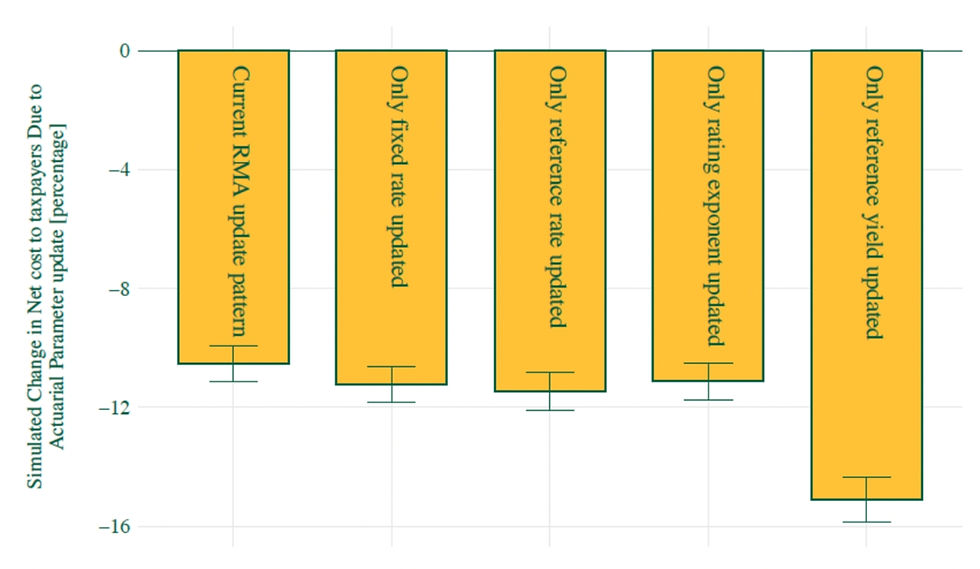 The figure also shows that targeted updates, particularly to reference yields, generate even larger cost reductions, highlighting the outsized fiscal importance of specific actuarial components. By contrast, up- dating all pricing components at the same time can sometimes reduce the impact of the most influential changes, since different adjustments may move in opposite directions. This finding suggests that a more targeted and flexible update strategy could further improve fiscal efficiency.
